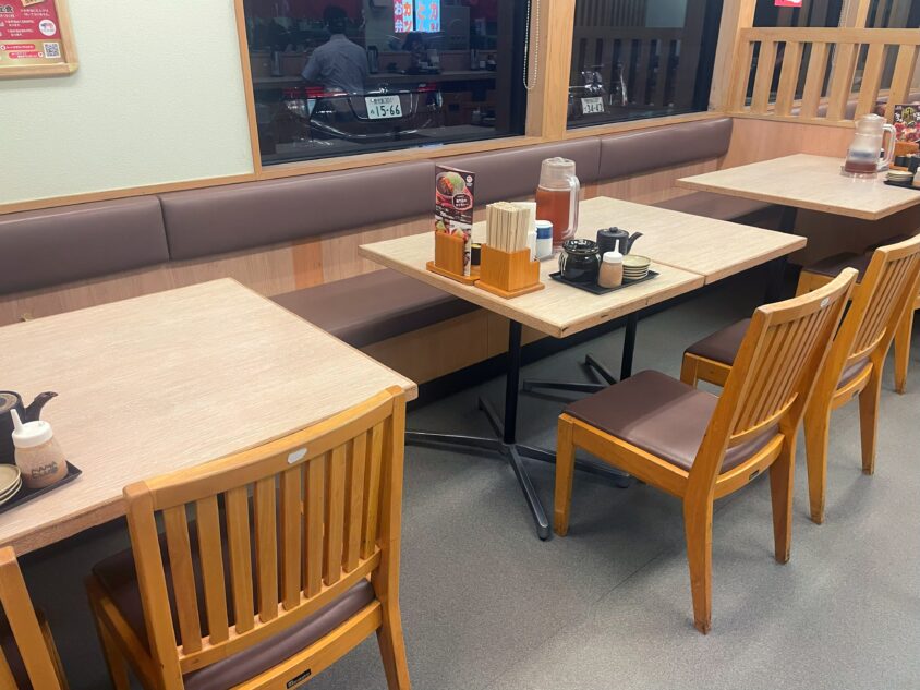 木目調のテーブルと落ち着いたブラウンのイス、そしてほどよく仕切られた客席のレイアウトが、まさに使いやすい食堂といった雰囲気です。