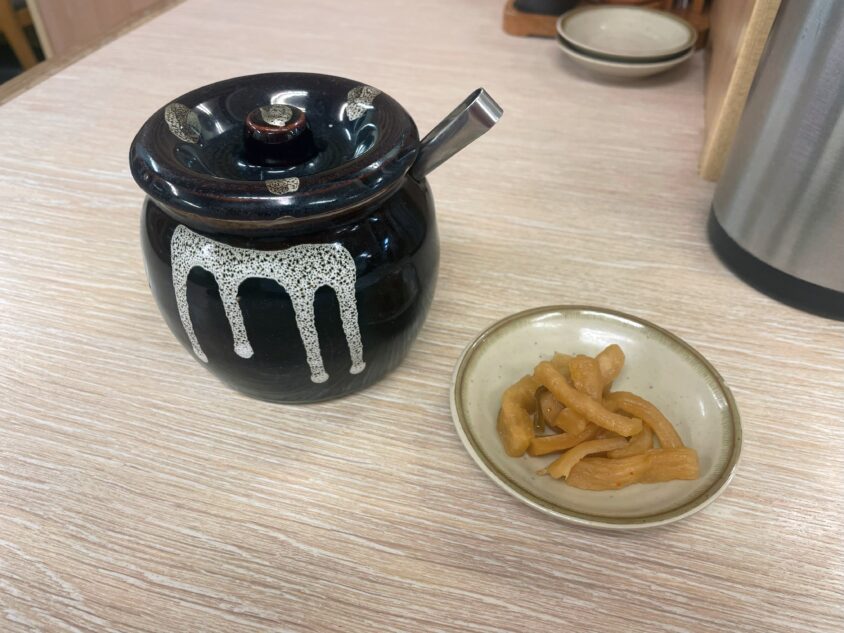 「かつや」では、シャキシャキのごぼう漬けが自由に楽しめます。