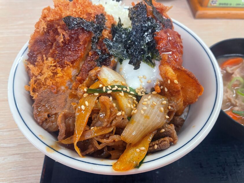 牛プルコギの甘辛ダレに、豚ロースカツのザクザク食感、さらにヤンニョム風味の鶏から揚げまで乗った贅沢丼。