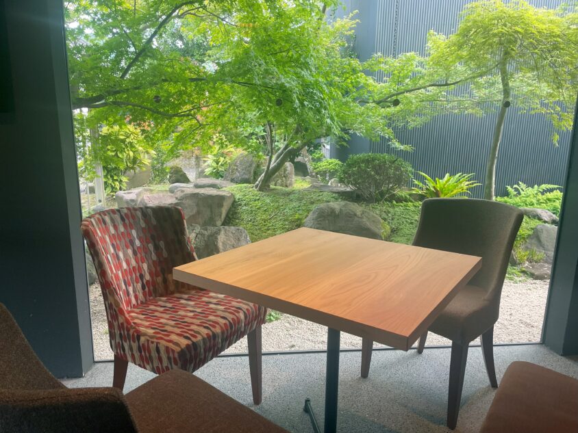大きな窓の外には美しい庭園が広がり、青々とした木々と岩の配置が見事で、まるで一幅の絵のよう。