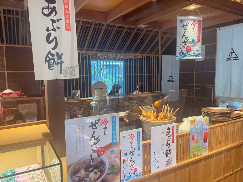 数ある商品の中から今回選んだのは、本店限定の「あぶり餅」(1本220円)、夏にぴったりの「冷やしぜんざい」(1杯460円)、そして人気洋菓子の「なめらかプリン」です。