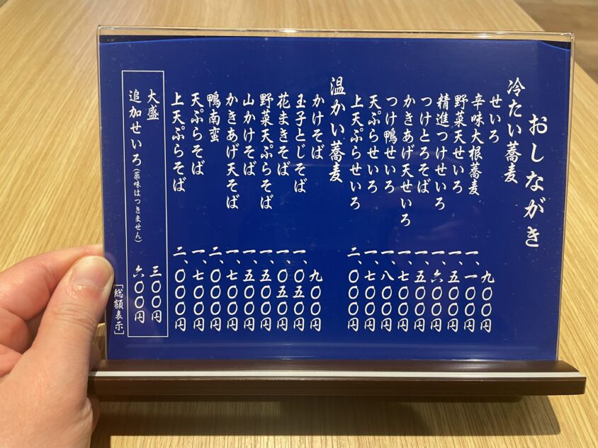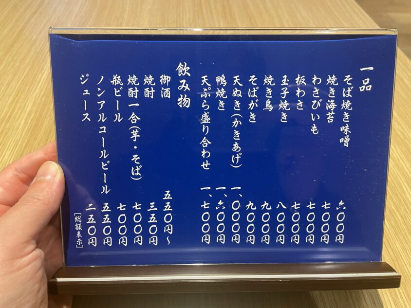 藍色の台紙に美しい白文字で書かれた品書きは、まるで蕎麦屋の詩集のようです。