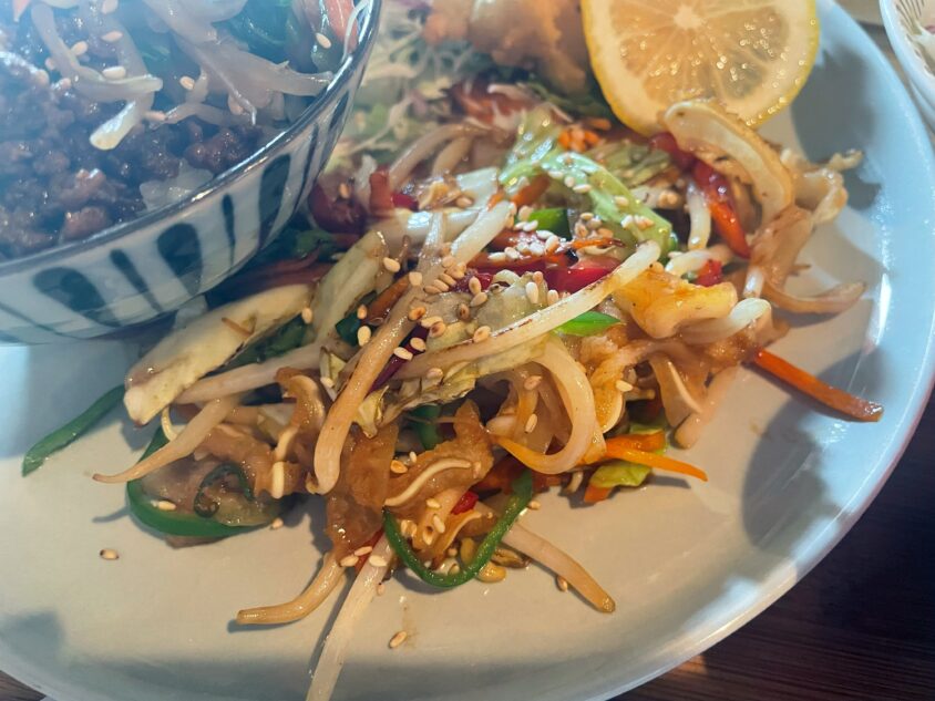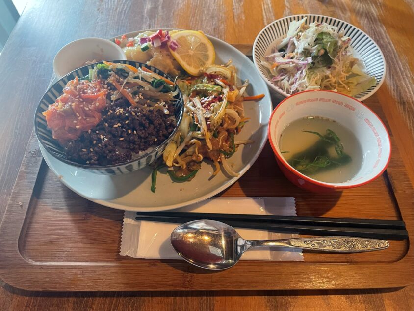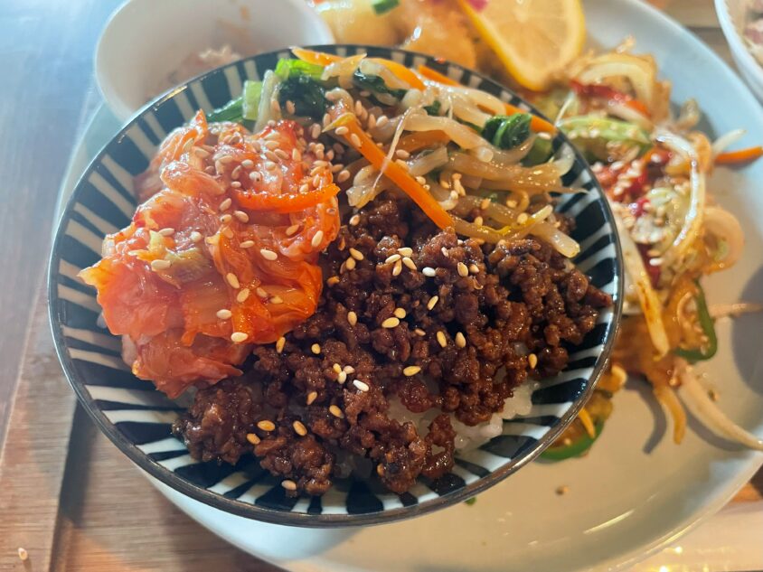 甘辛のミンチ肉、ナムル、そして鮮やかなキムチの組み合わせは、見た目以上に力強い味わい。