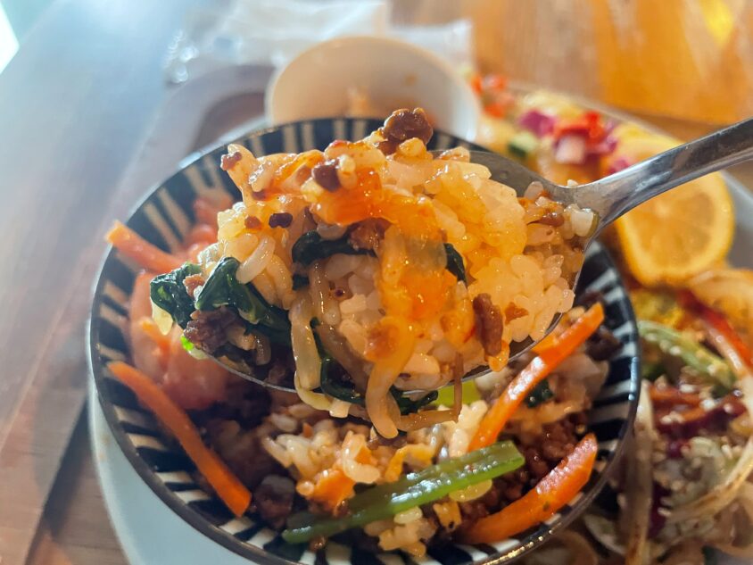 韓国料理の定番、たっぷりの野菜と甘辛ミンチがごはんに絡み、混ぜる楽しさも味わえる欲張りメニュー。