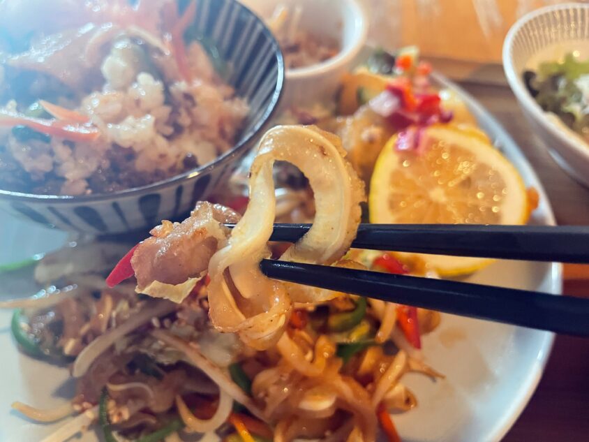 シャキシャキの野菜とコリッとしたミミガーの食感が絶妙なバランス。