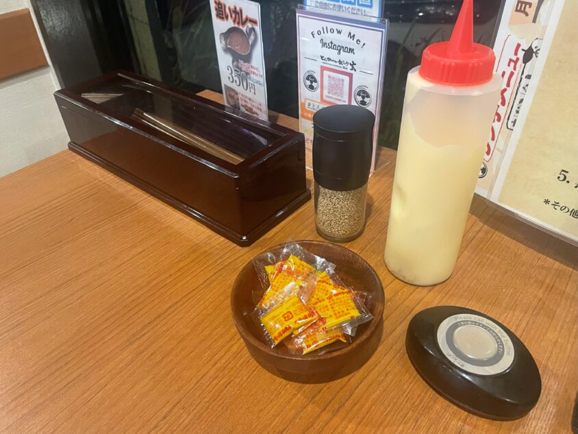 まず卓上には、マヨネーズ、ゴマ、からし、呼び出しボタンが完備。