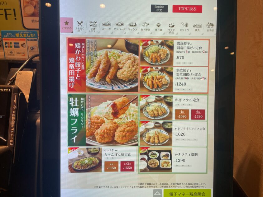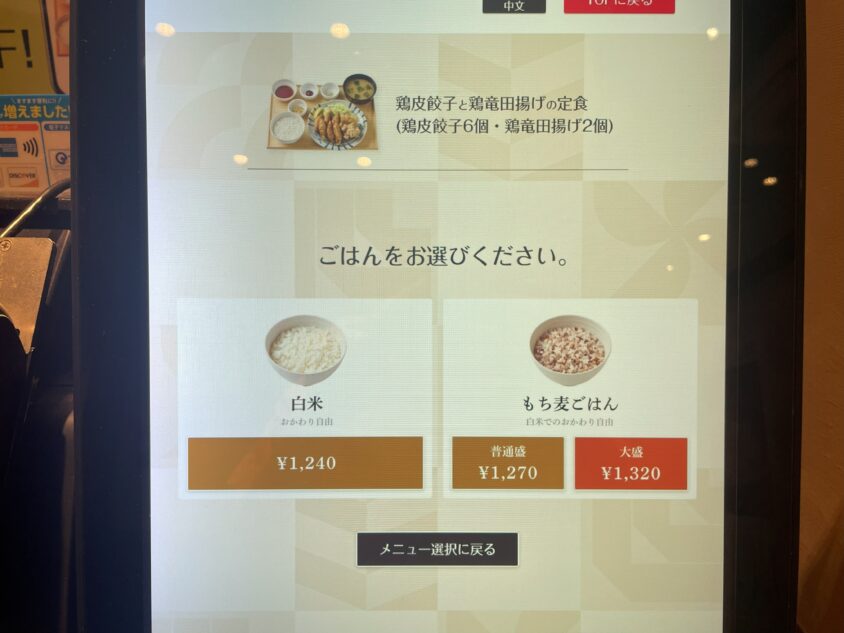 そして今回のお目当て、「鶏かわ餃子と鶏竜田揚げの定食」も堂々と掲示されており、期待感がどんどん高まってきます。