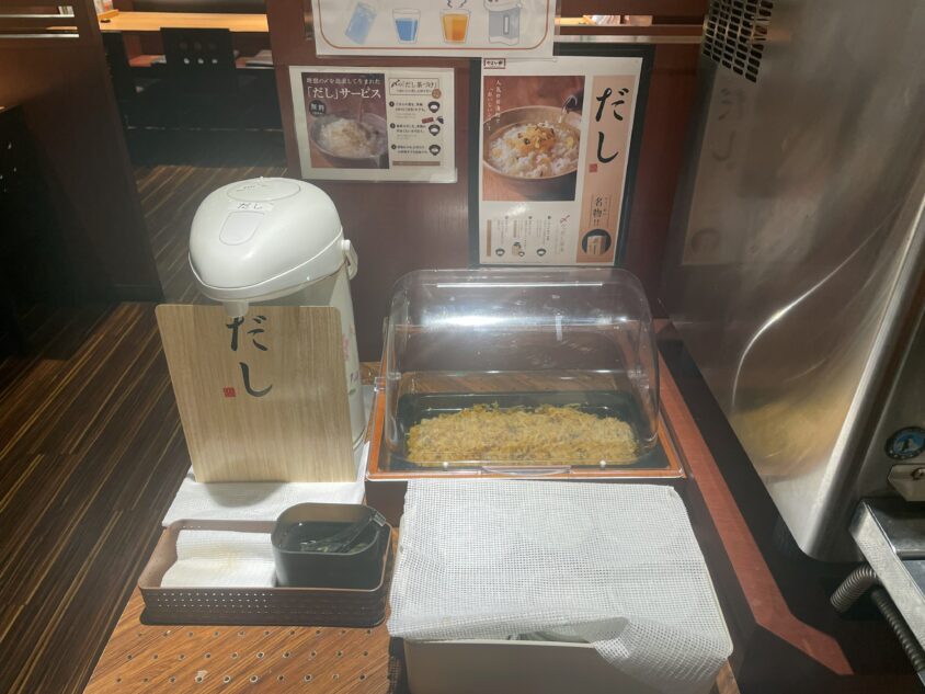セルフでのおかわりロボや、だし&漬物コーナーといったちょっと嬉しいサービスも健在で、