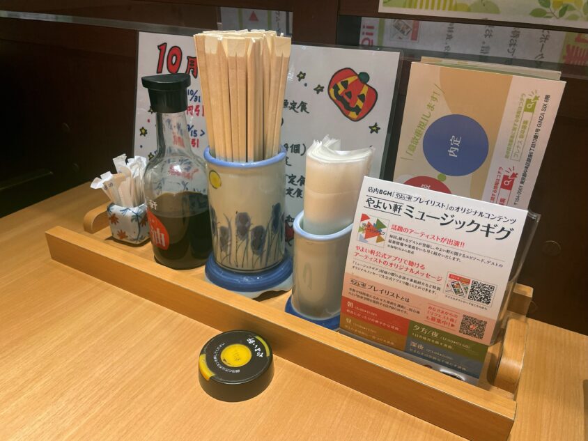 テーブルには、醤油、つまようじ、紙ナプキン、お箸などの基本セットがしっかり完備。