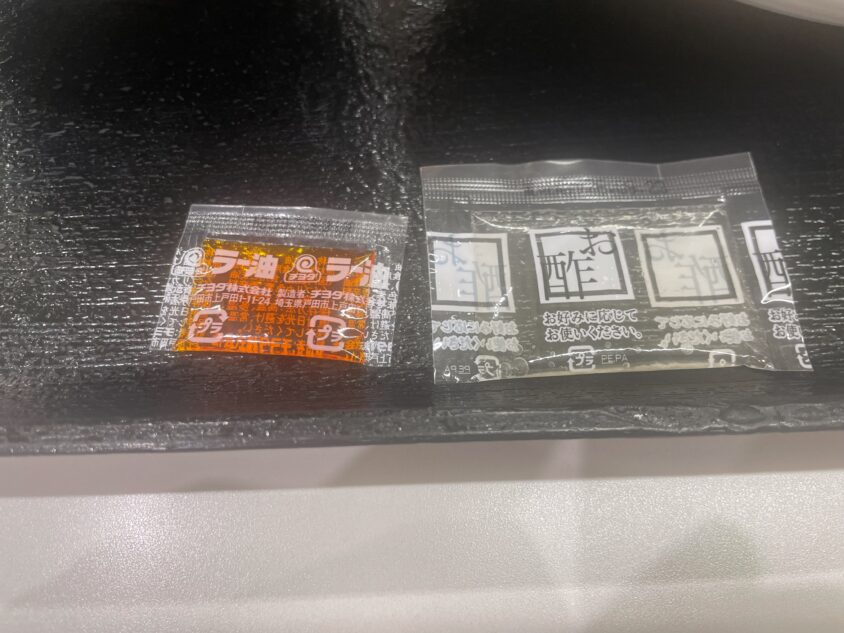 今回はラー油と酢が付いてきます。